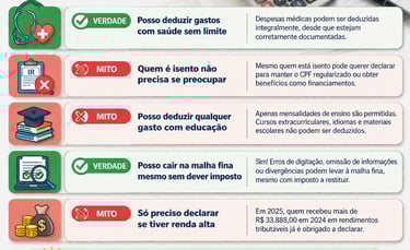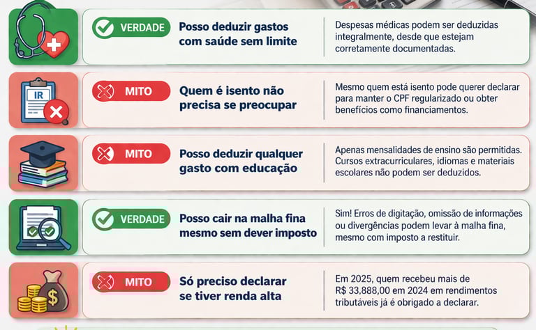 Na hora de declarar o Imposto de Renda, muitos contribuintes acabam cometendo erros por acreditar em informações incompletas ou equivocadas. Alguns desses erros podem resultar em pagamento maior de imposto, perda de restituição ou até problemas com a Receita Federal. Veja os principais mitos e verdades.